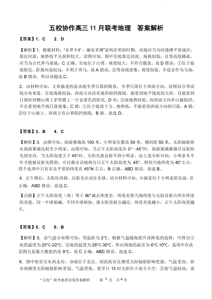 福建省“宁化、永安、尤溪、大田、沙县一中”五校协作2023-2024学年高三上学期11月联考 地理答案