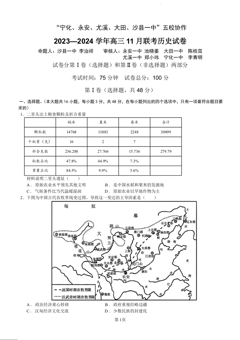 福建省“宁化、永安、尤溪、大田、沙县一中”五校协作2023-2024学年高三上学期11月联考 历史