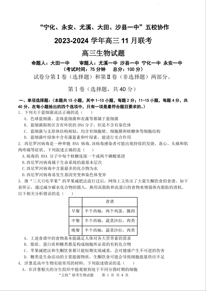 福建省“宁化、永安、尤溪、大田、沙县一中”五校协作2023-2024学年高三上学期11月联考 生物