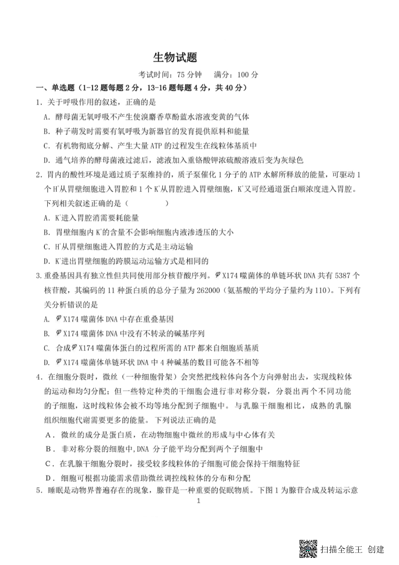 福建省2023届高三4月联合测评 生物