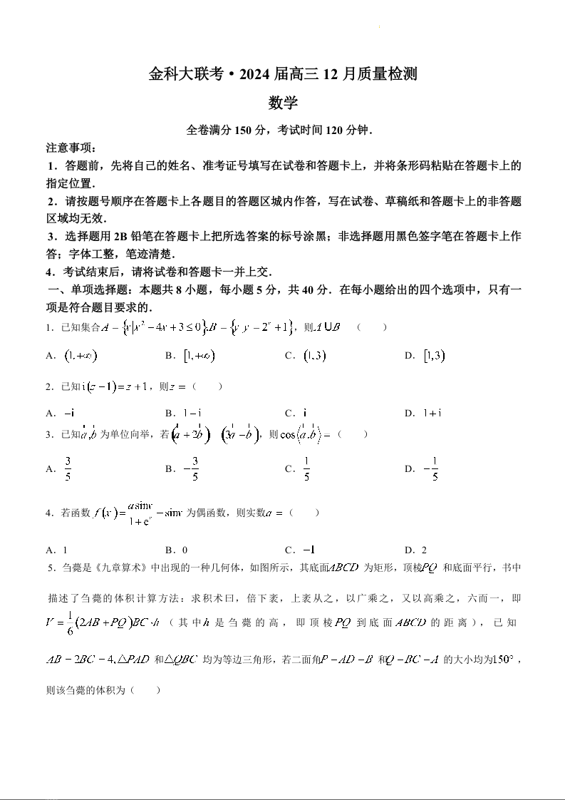 福建省百校联考2023-2024学年高三上学期12月月考 数学
