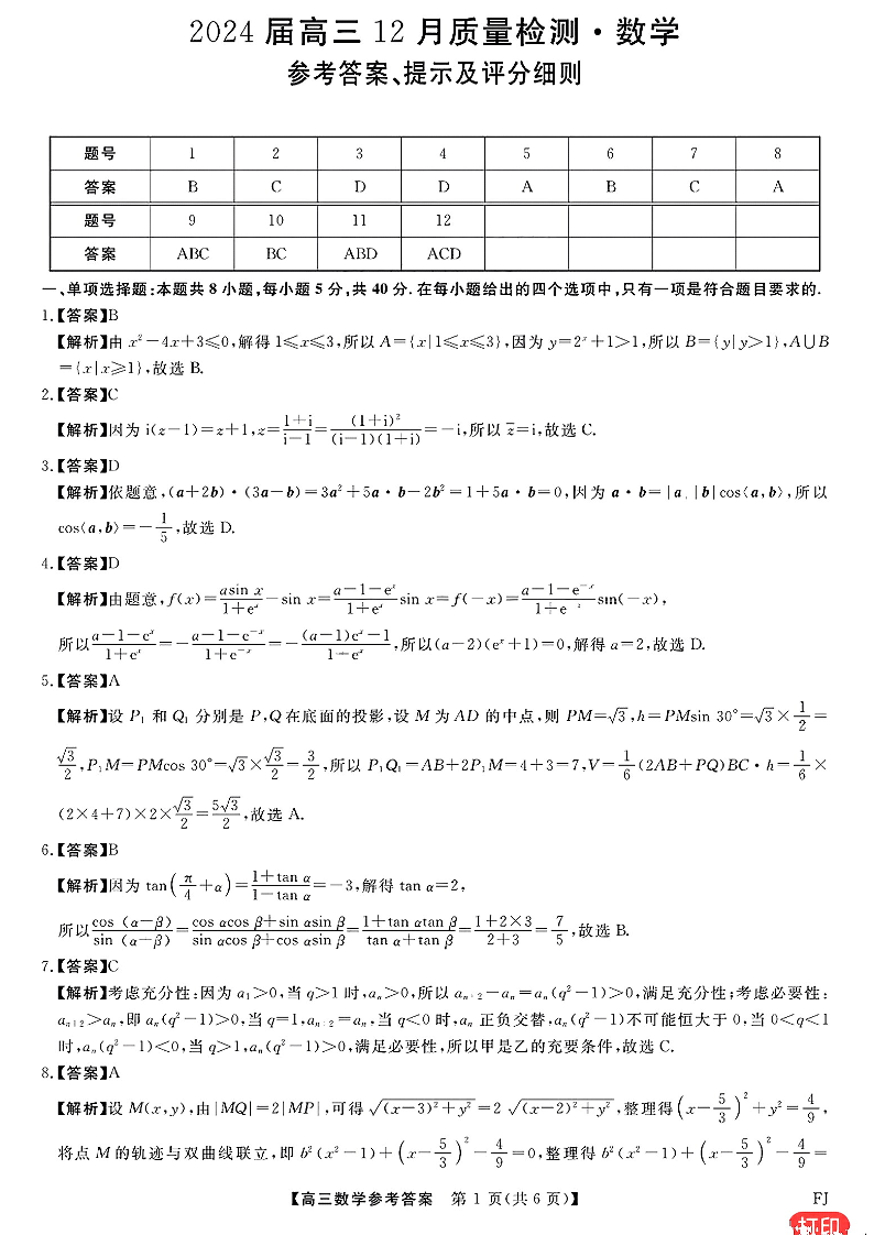 福建省百校联考2023-2024学年高三上学期12月月考 数学答案