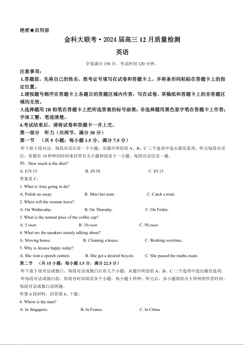 福建省百校联考2023-2024学年高三上学期12月月考 英语