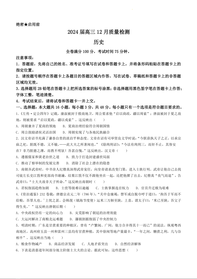 福建省百校联考2023-2024学年高三上学期12月月考 历史