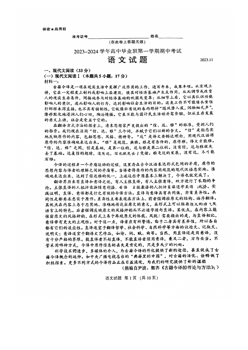 福建省百校联考2023-2024学年高三上学期期中考试 语文