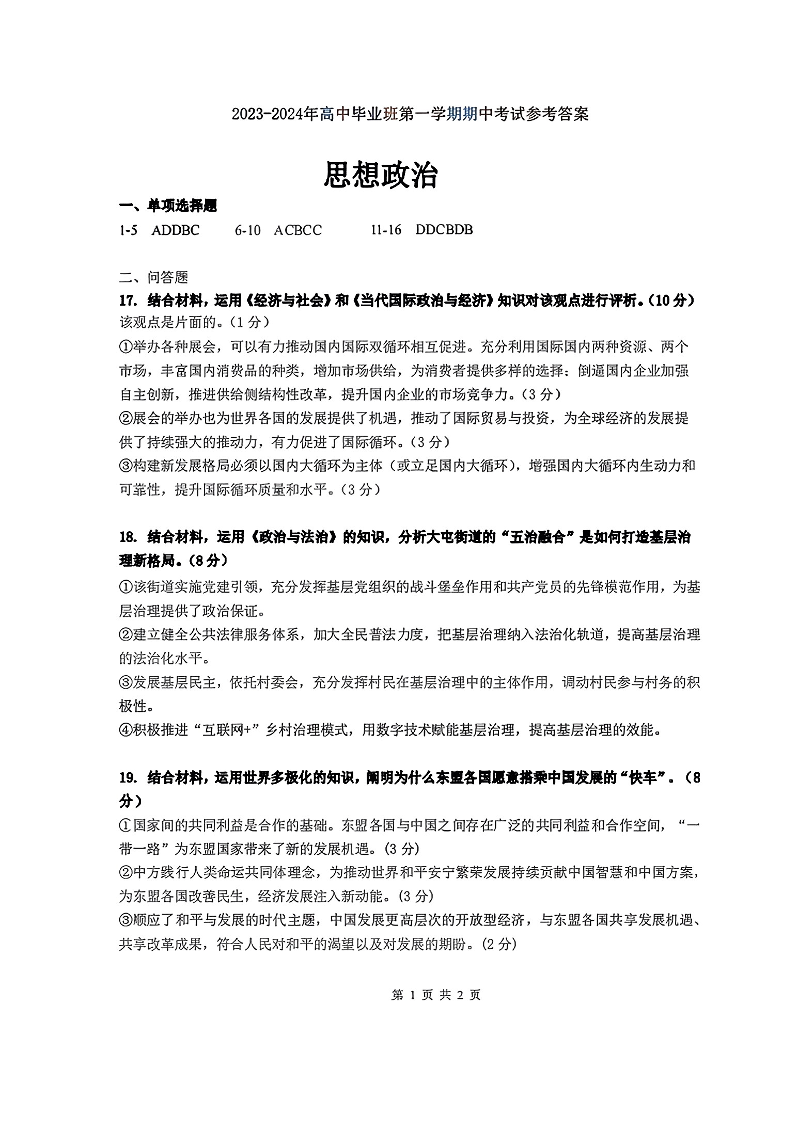 福建省百校联考2023-2024学年高三上学期期中考试 政治答案
