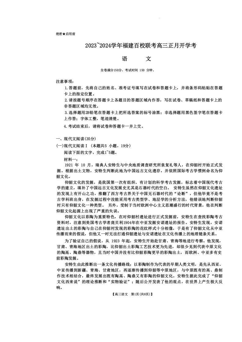 福建省百校联考2023-2024学年高三下学期正月开学考试 语文