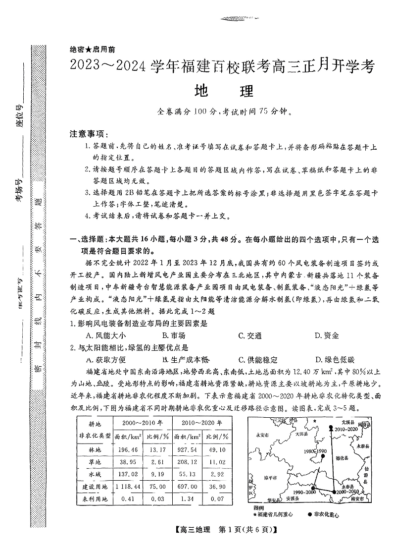 福建省百校联考2023-2024学年高三下学期正月开学考试 地理