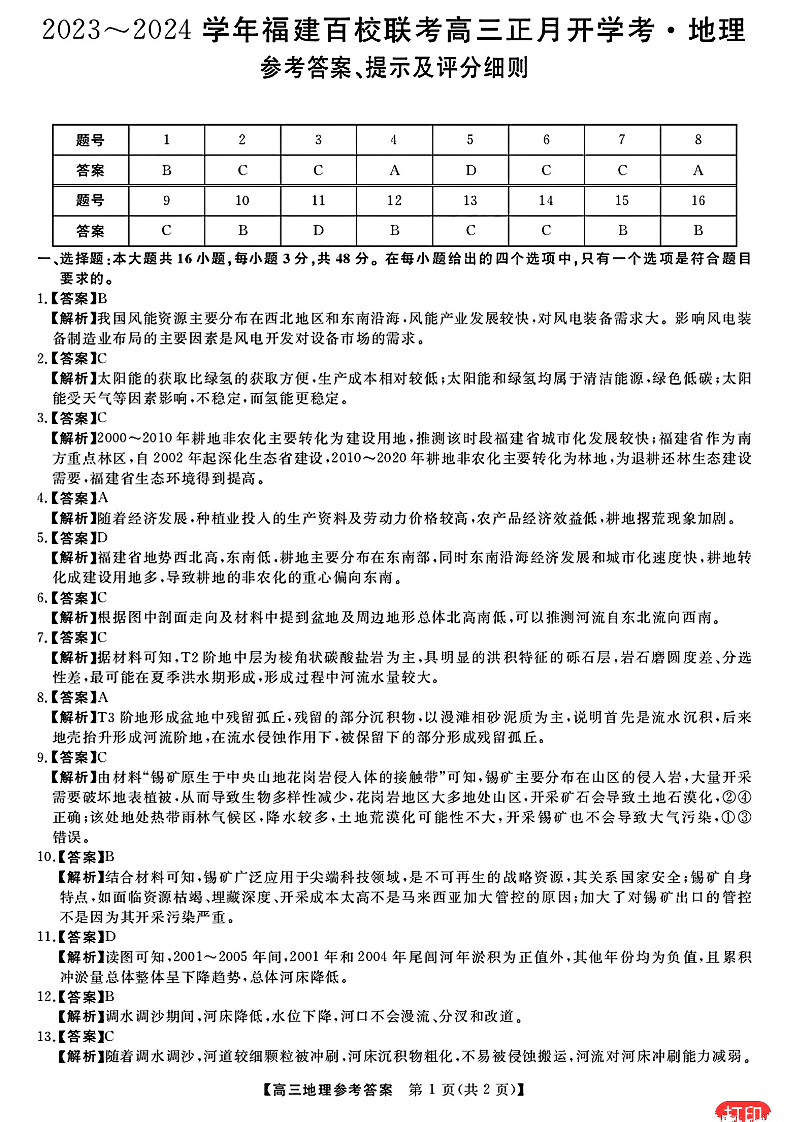 福建省百校联考2023-2024学年高三下学期正月开学考试 地理答案