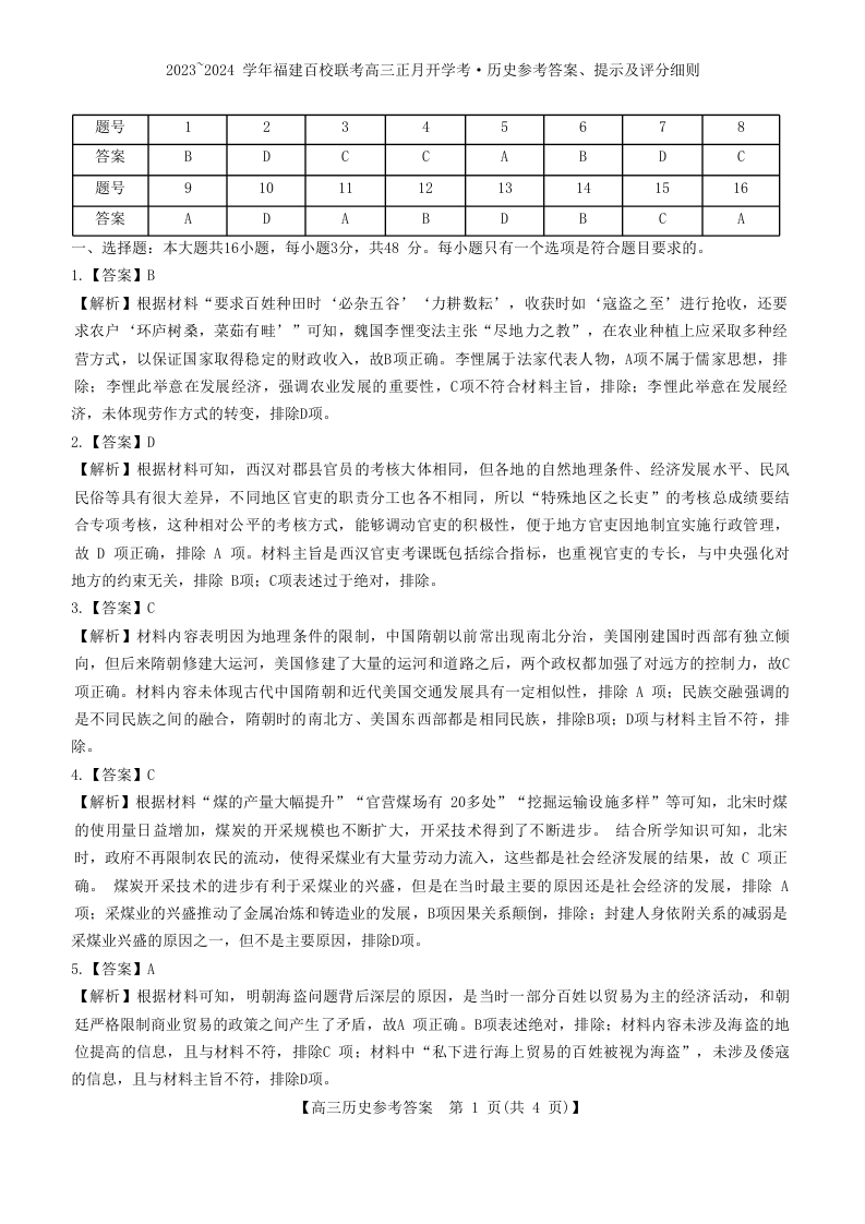 福建省百校联考2023-2024学年高三下学期正月开学考试 历史答案