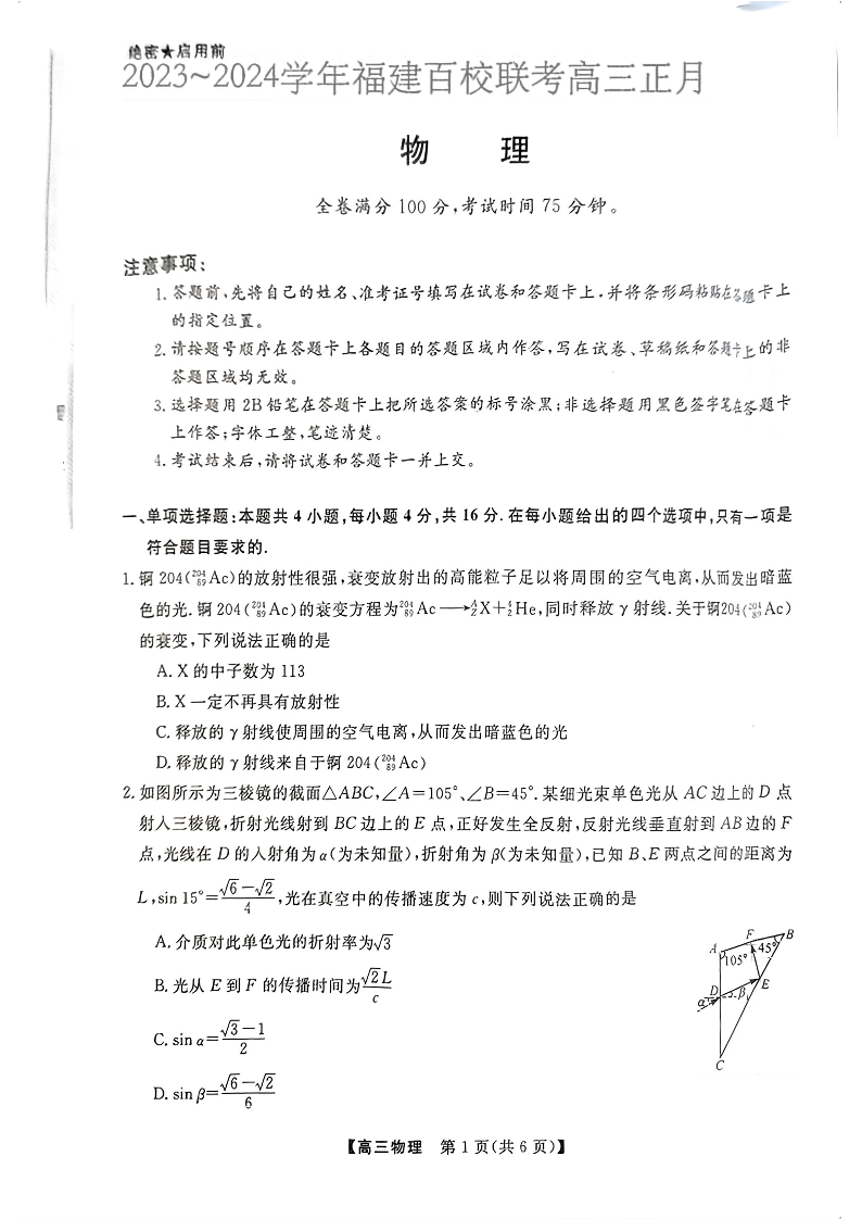福建省百校联考2023-2024学年高三下学期正月开学考试 物理