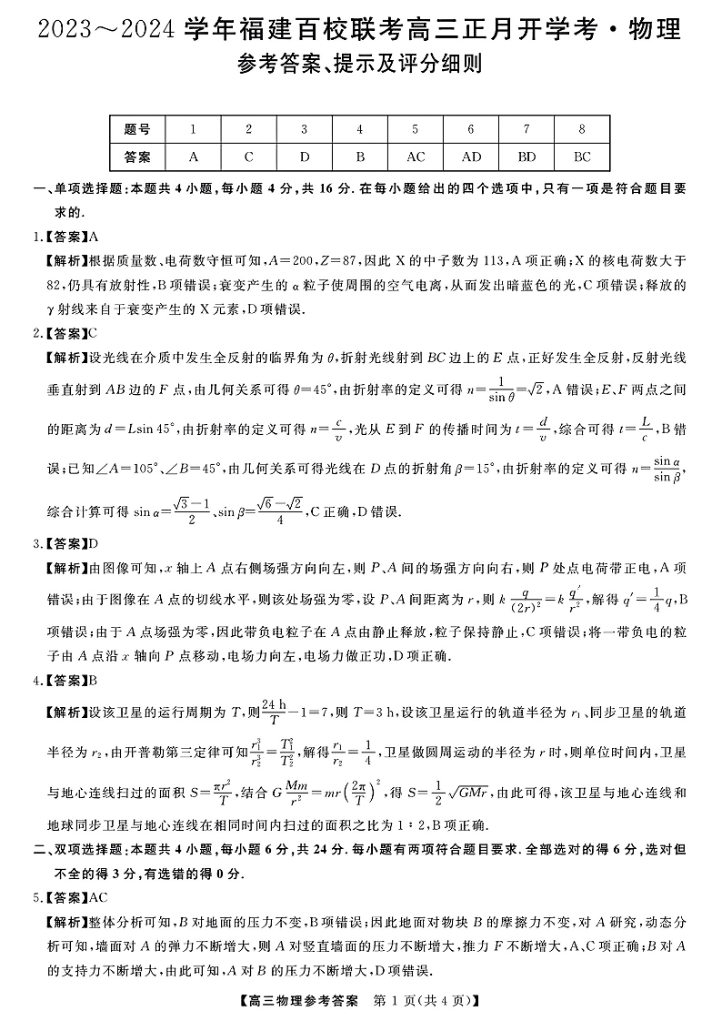 福建省百校联考2023-2024学年高三下学期正月开学考试 物理答案