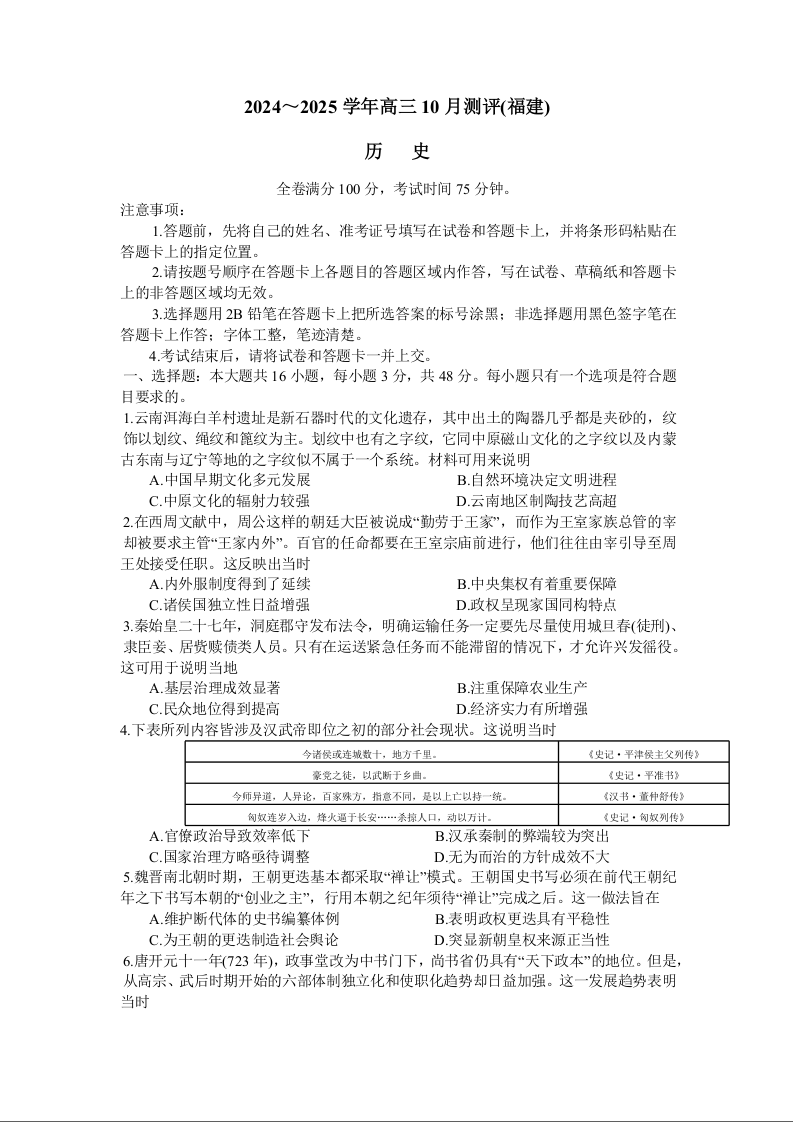 福建省百校联考2024-2025学年高三上学期10月测评+历史