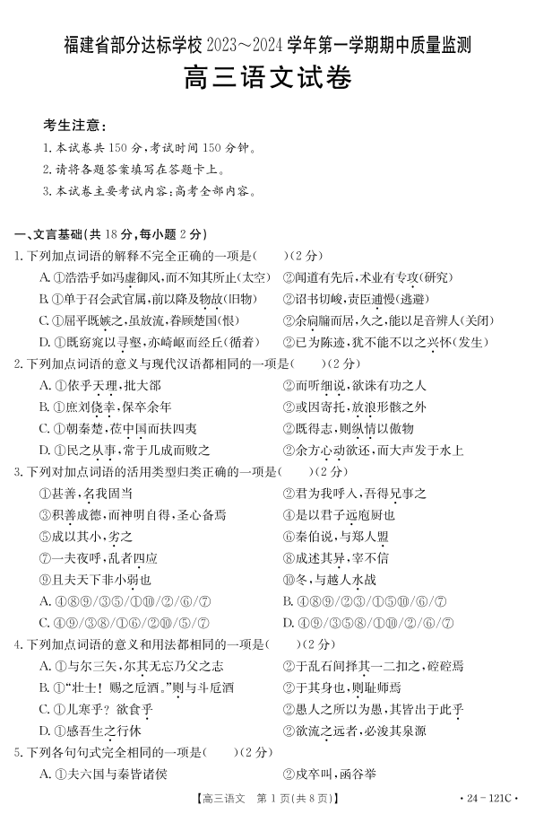 福建省部分达标学校2023-2024学年高三上学期期中质量监测 语文