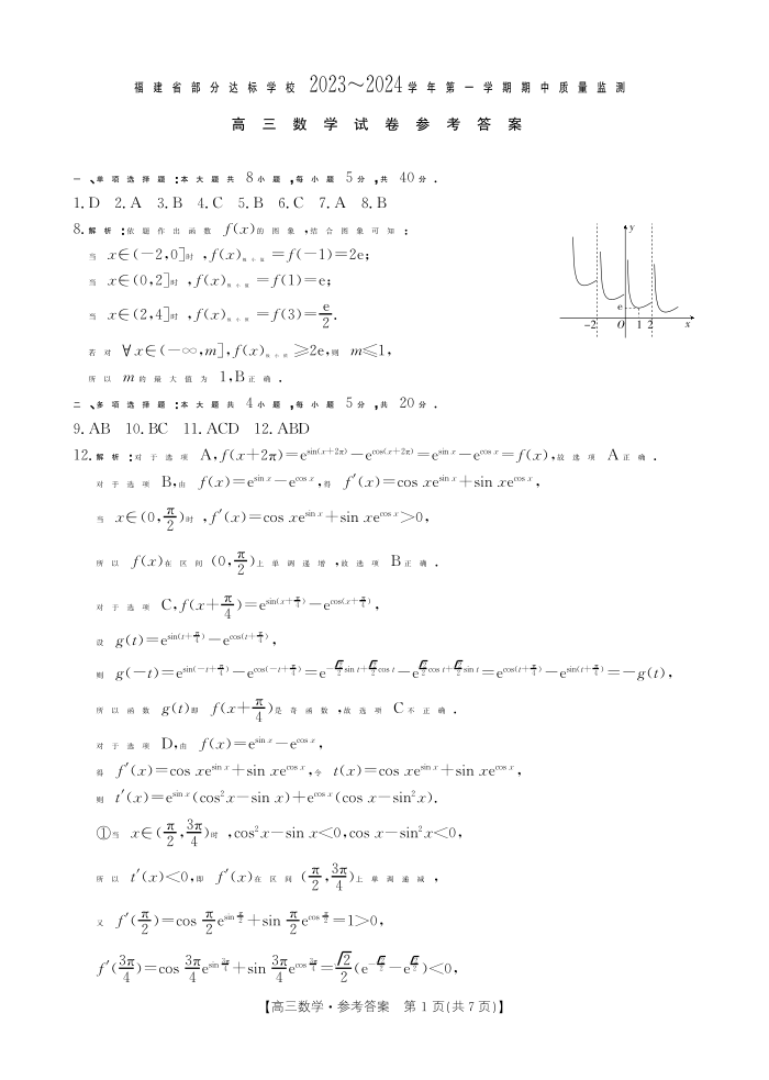 福建省部分达标学校2023-2024学年高三上学期期中质量监测 数学答案