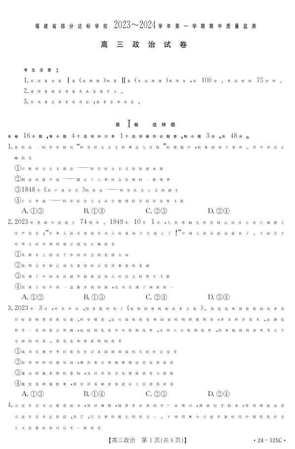 福建省部分达标学校2023-2024学年高三上学期期中质量监测 思想政治