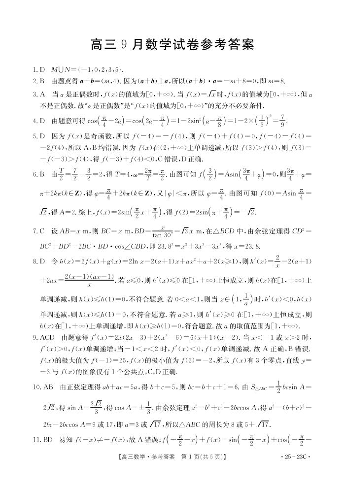 福建省部分学校2025届高三9月开学大联考+数学答案