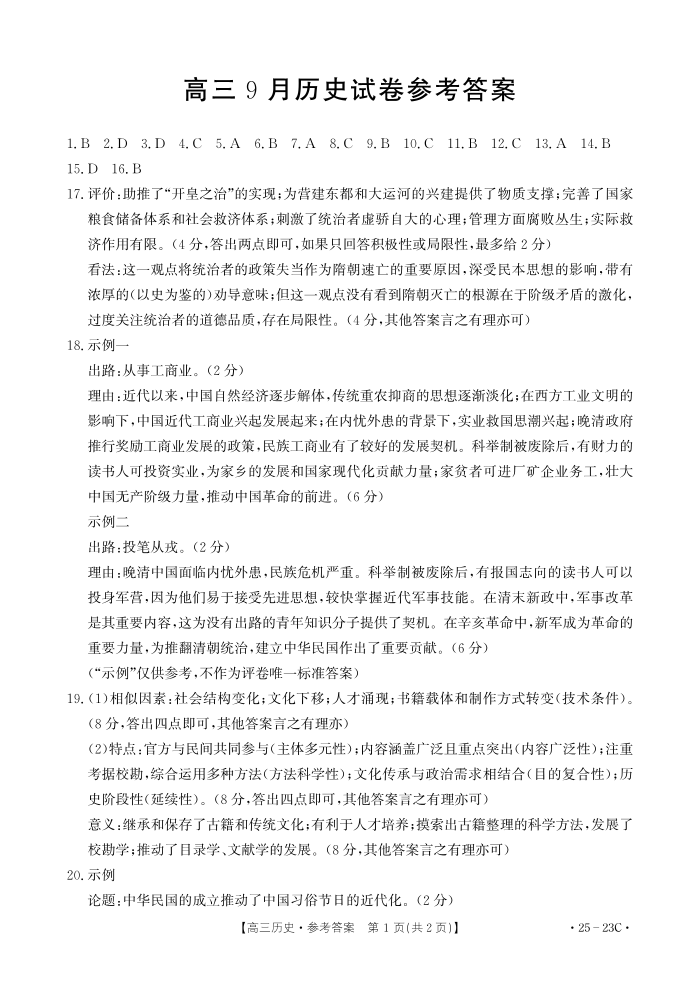 福建省部分学校2025届高三9月开学大联考+历史答案