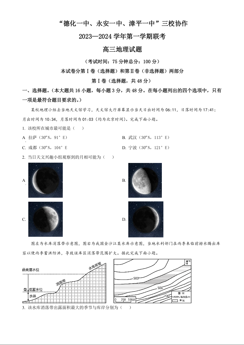 福建省德化一中、永安一中、漳平一中三校协作2023-2024学年高三上学期12月联考试题 地理