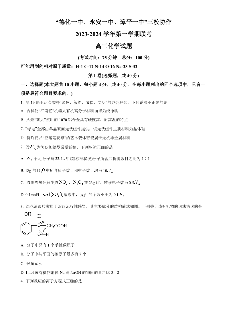 福建省德化一中、永安一中、漳平一中三校协作2023-2024学年高三上学期12月联考试题 化学