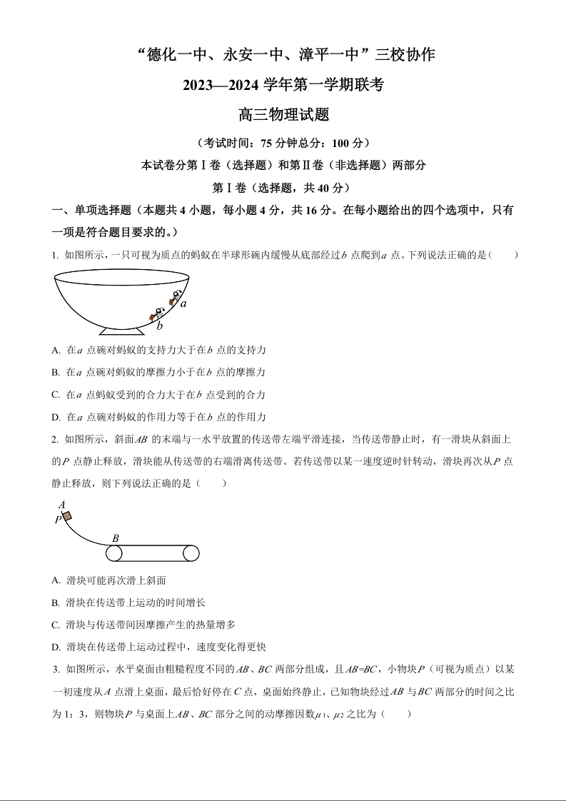 福建省德化一中、永安一中、漳平一中三校协作2023-2024学年高三上学期12月联考试题 物理