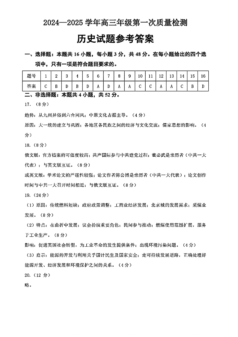 福建省福州市2024-2025学年高三年级上学期第一次质量检测+历史答案