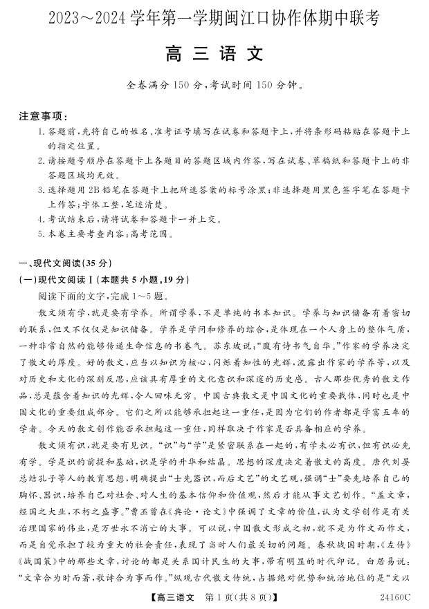 福建省福州市闽江口协作体2023-2024学年高三上学期11月期中联考 语文
