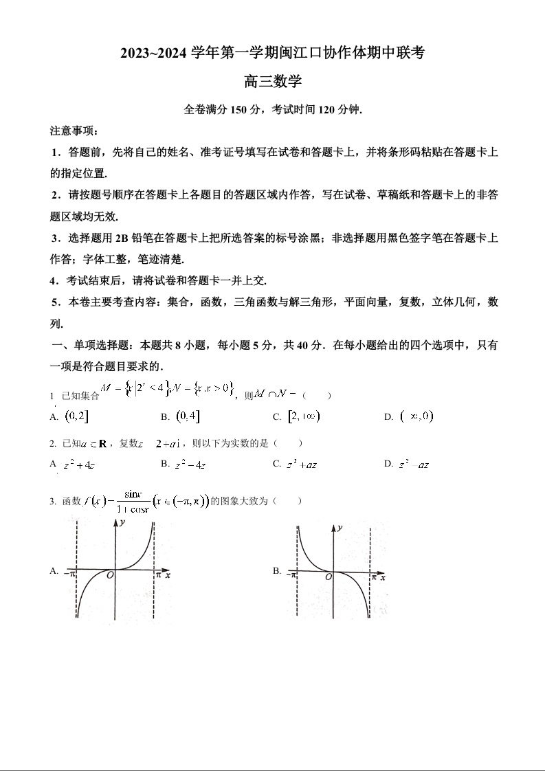 福建省福州市闽江口协作体2023-2024学年高三上学期11月期中联考 数学