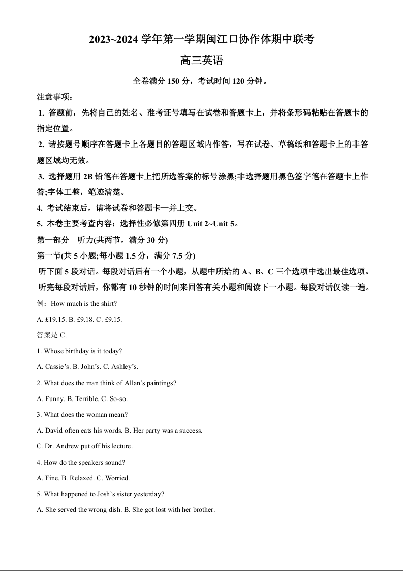 福建省福州市闽江口协作体2023-2024学年高三上学期11月期中联考 英语