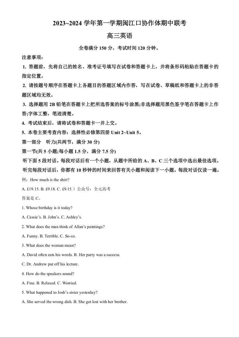 福建省福州市闽江口协作体2023-2024学年高三上学期11月期中联考 英语答案
