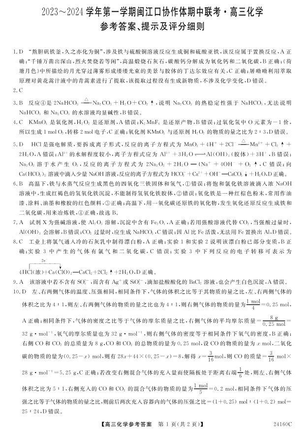 福建省福州市闽江口协作体2023-2024学年高三上学期11月期中联考 化学答案
