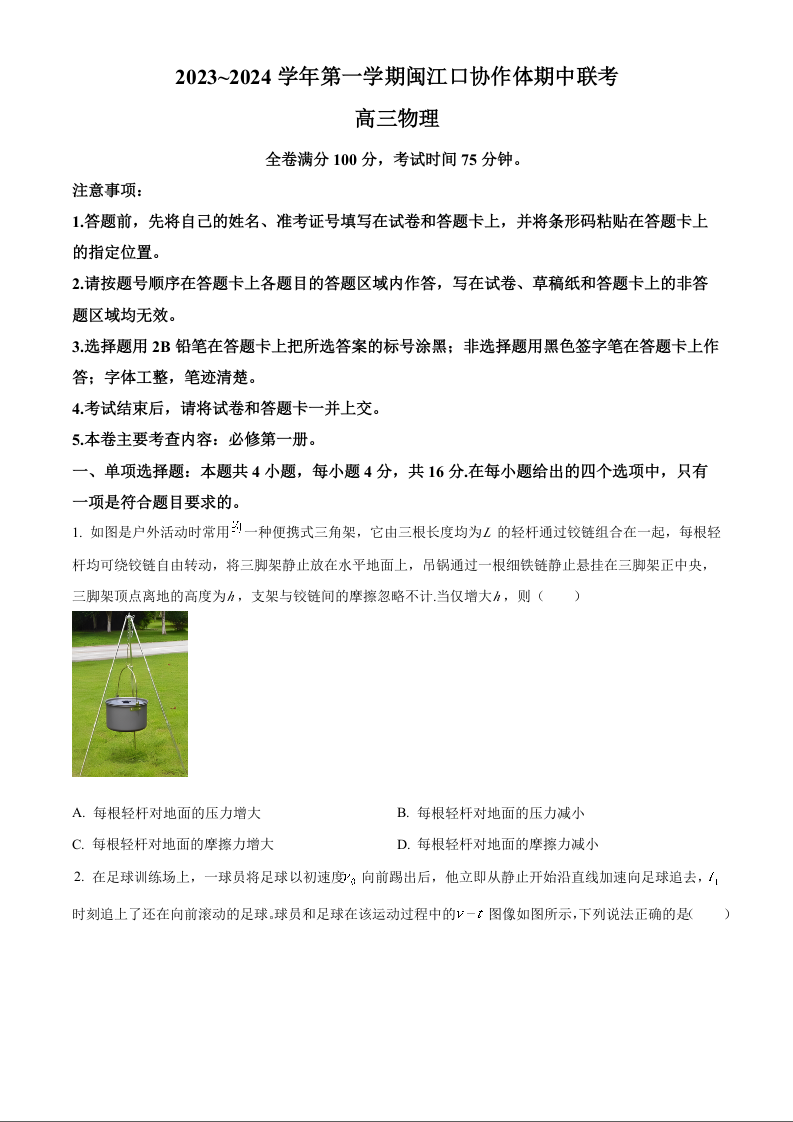 福建省福州市闽江口协作体2023-2024学年高三上学期11月期中联考 物理