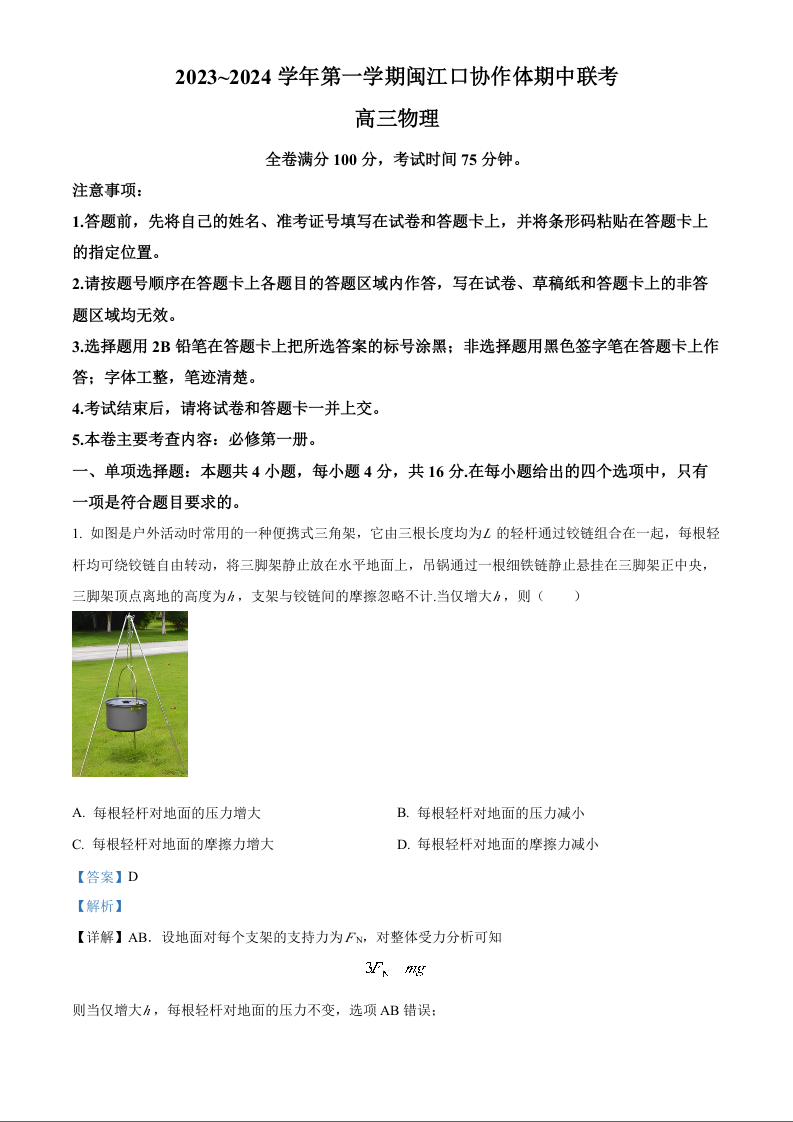 福建省福州市闽江口协作体2023-2024学年高三上学期11月期中联考 物理答案