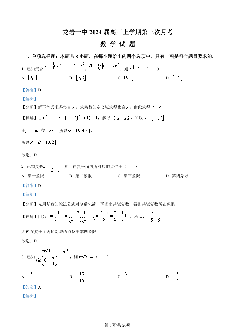 福建省龙岩第一中学2023-2024学年高三上学期第三次月考 数学答案
