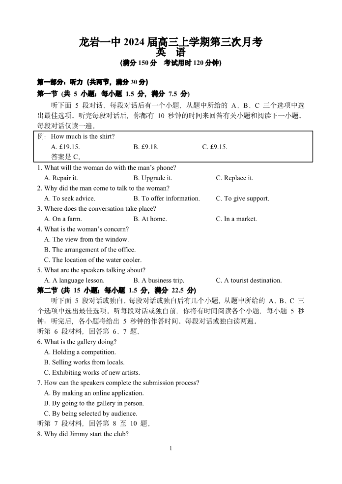 福建省龙岩第一中学2023-2024学年高三上学期第三次月考 英语