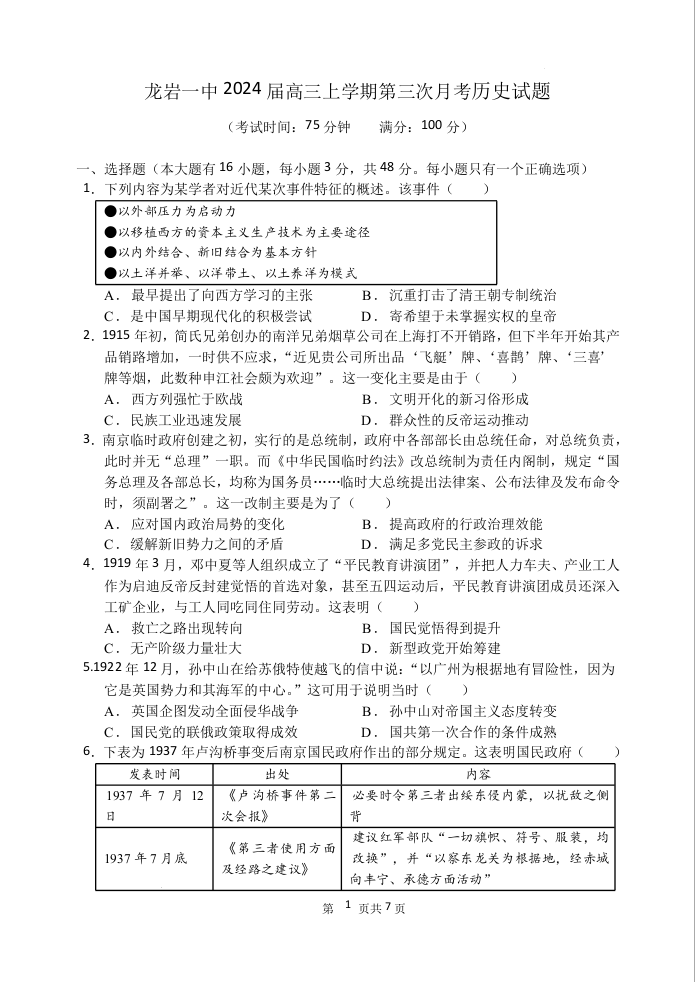 福建省龙岩第一中学2023-2024学年高三上学期第三次月考 历史