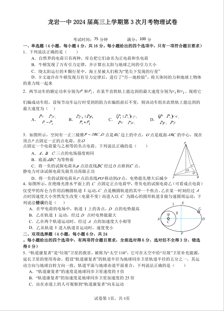 福建省龙岩第一中学2023-2024学年高三上学期第三次月考 物理