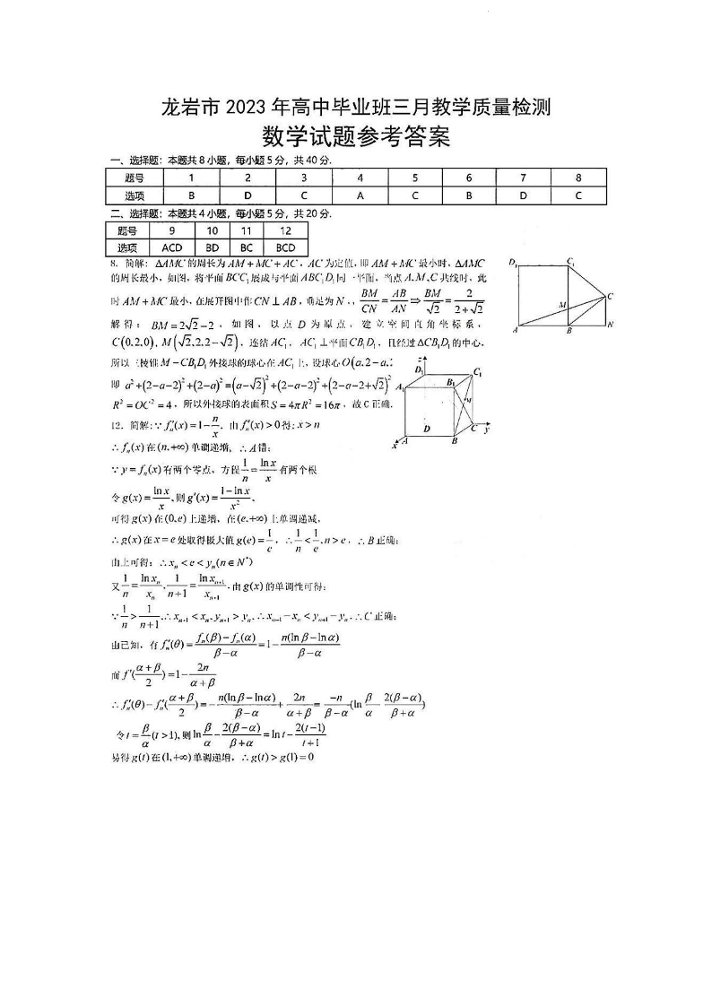 2023福建省龙岩市高三3月教学质量检测数学答案