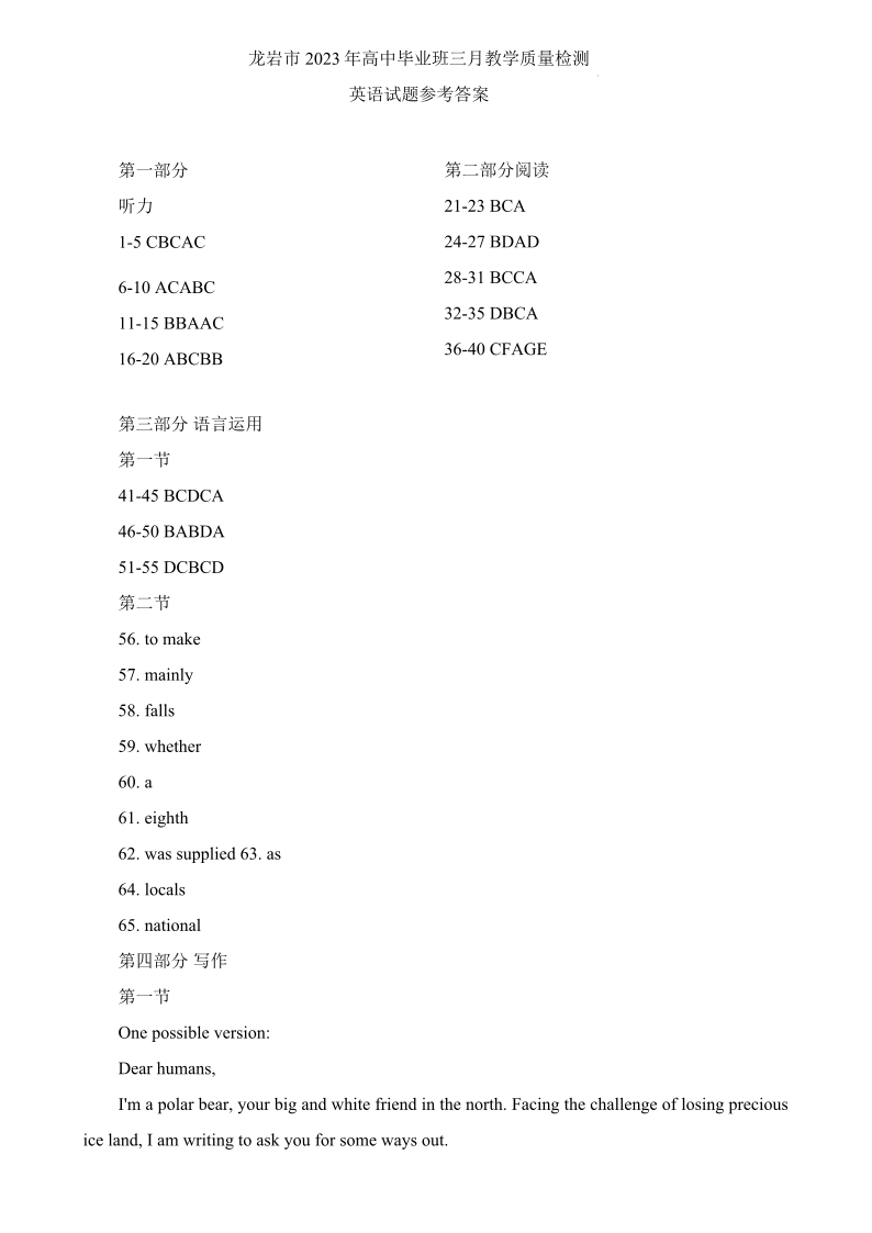 2023福建省龙岩市高三3月教学质量检测英语答案