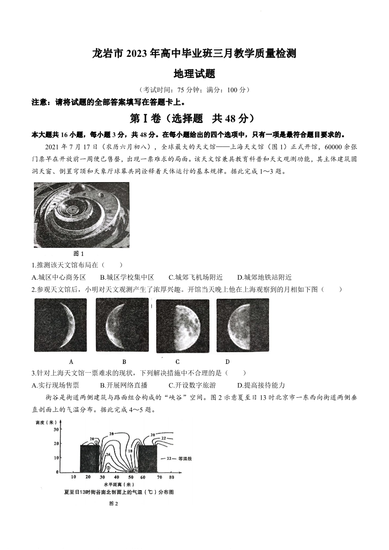 2023福建省龙岩市高三3月教学质量检测地理