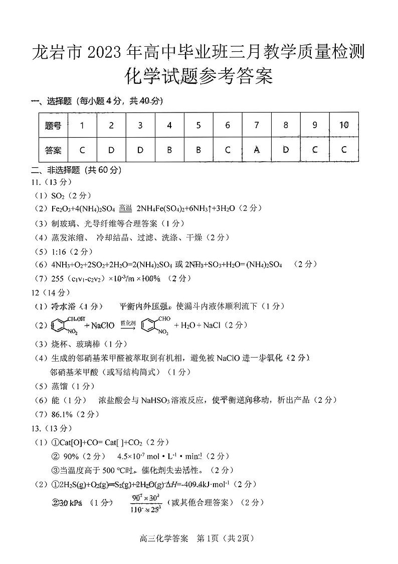 2023福建省龙岩市高三3月教学质量检测化学答案