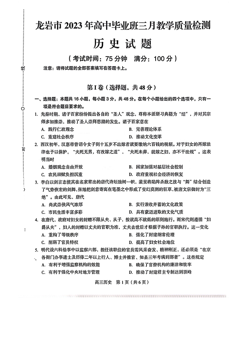 2023福建省龙岩市高三3月教学质量检测历史