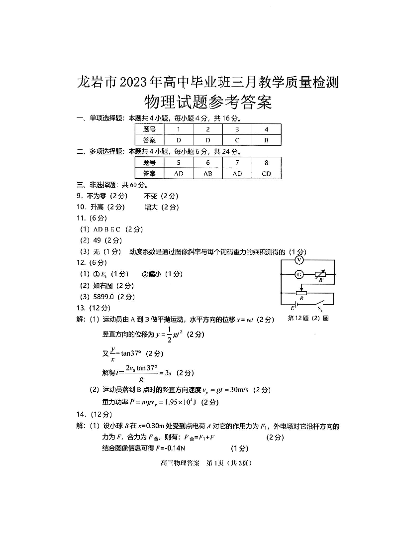 2023福建省龙岩市高三3月教学质量检测物理答案