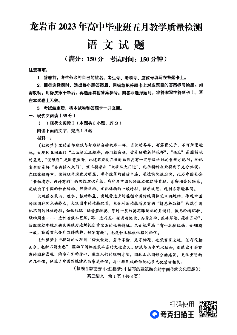 龙岩市2023年高中毕业班五月教学质量检测 语文