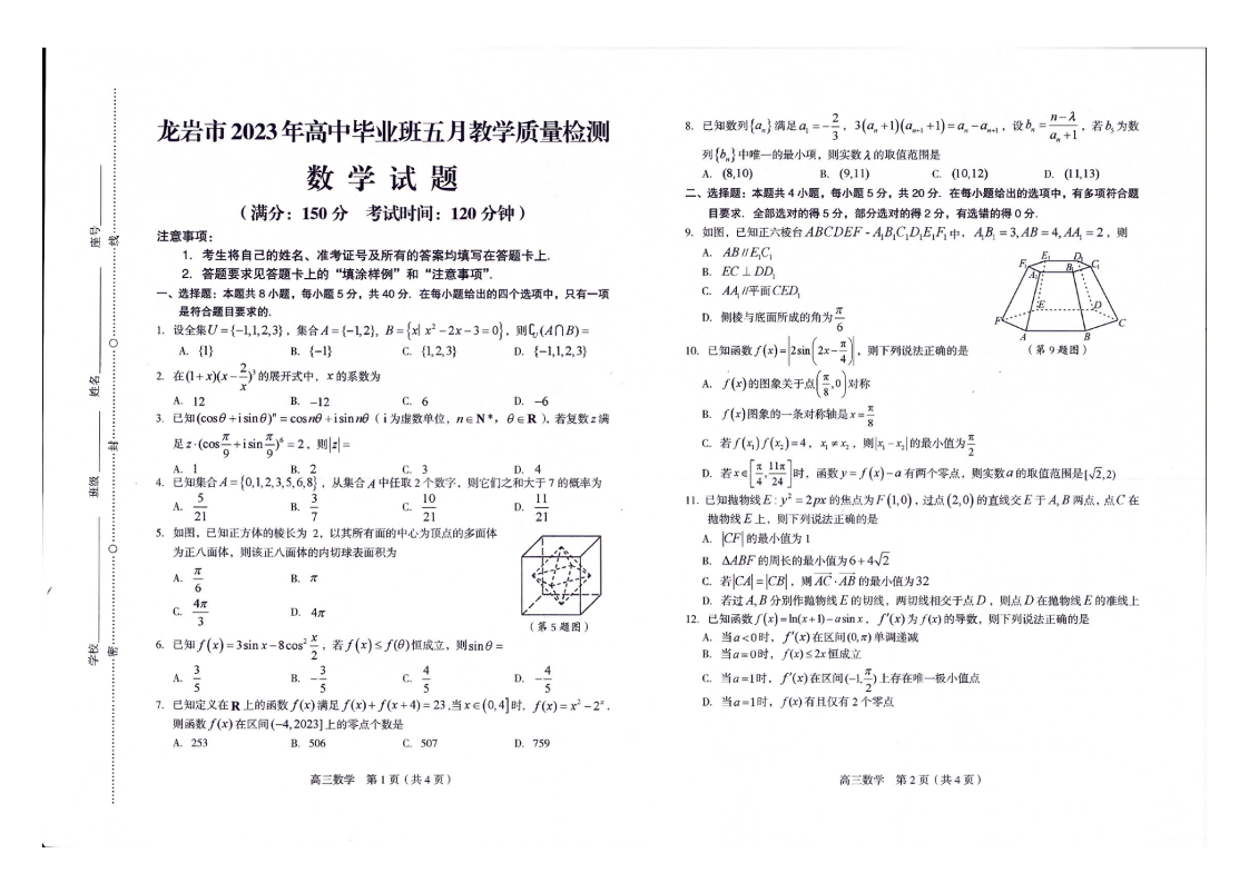 龙岩市2023年高中毕业班五月教学质量检测 数学