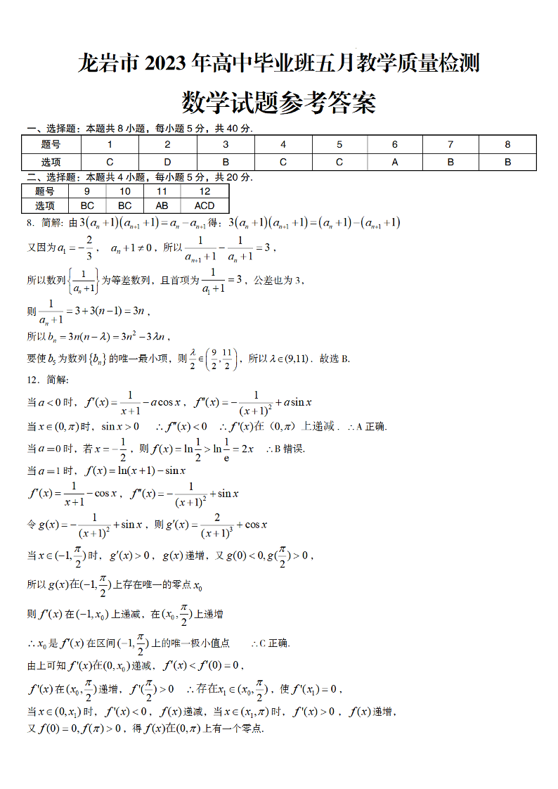 龙岩市2023年高中毕业班五月教学质量检测 数学答案·