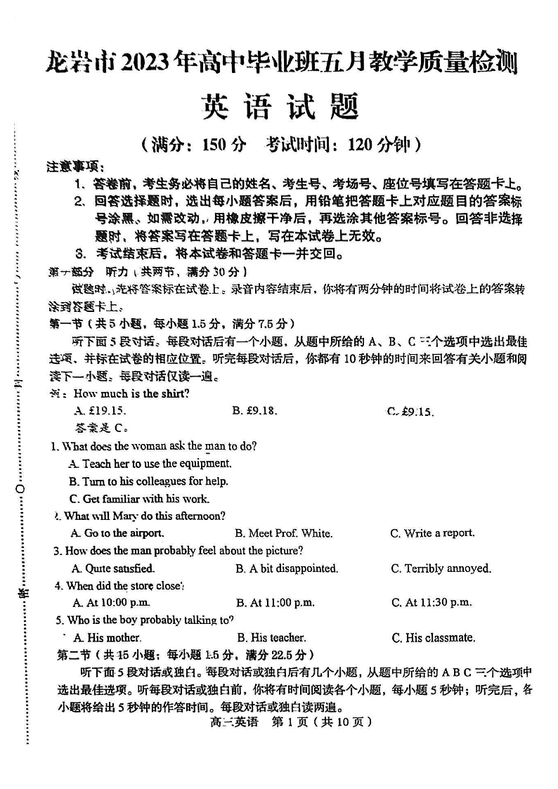龙岩市2023年高中毕业班五月教学质量检测 英语