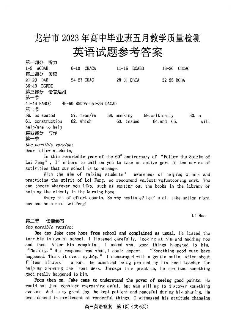 龙岩市2023年高中毕业班五月教学质量检测 英语答案