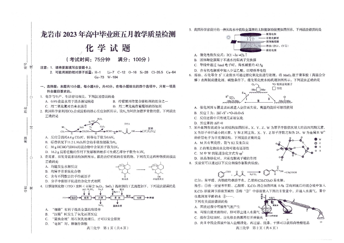 龙岩市2023年高中毕业班五月教学质量检测 化学