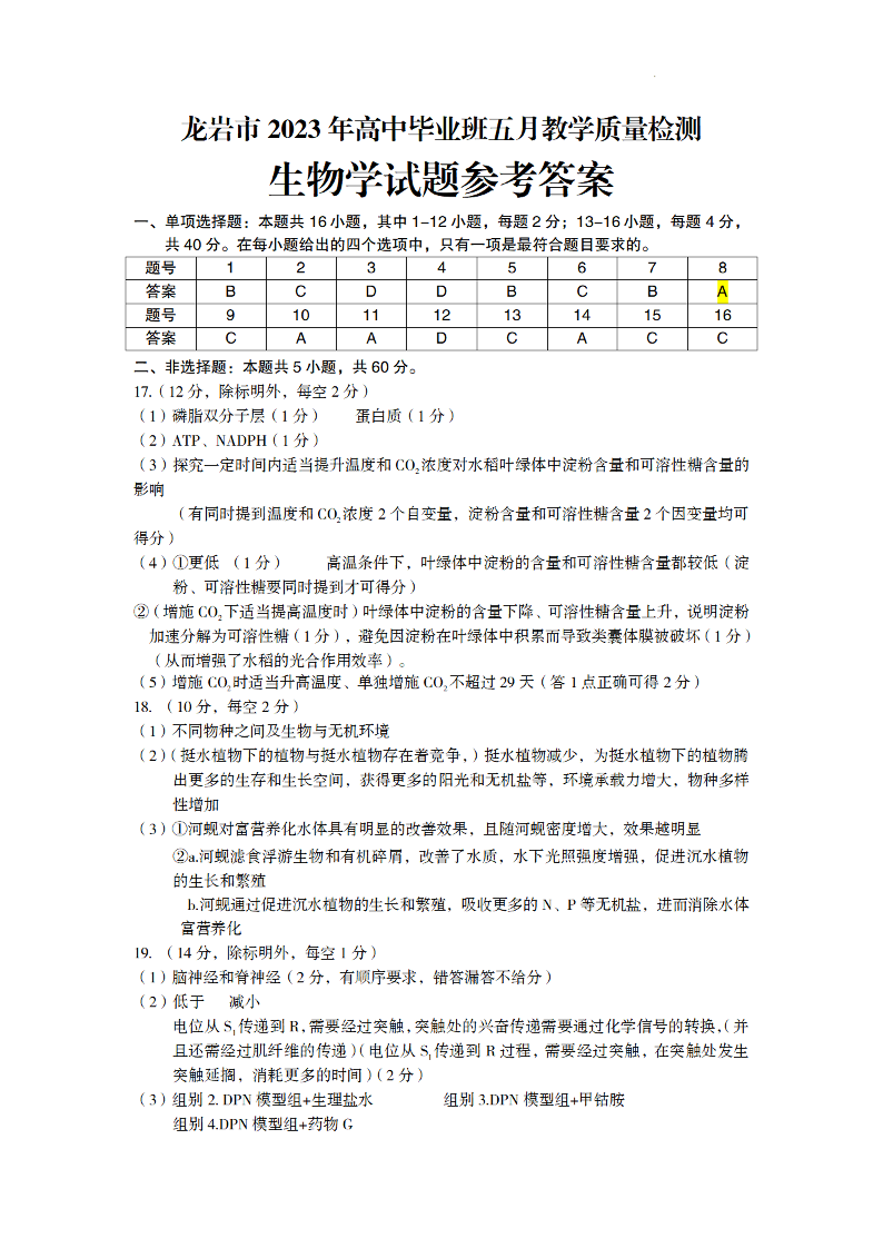 龙岩市2023年高中毕业班五月教学质量检测 生物答案